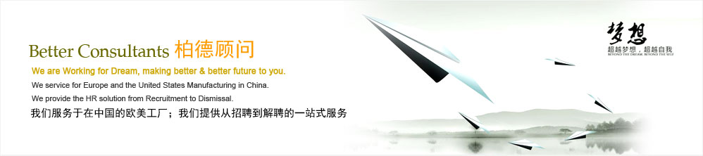 背景:柏德公司自創(chuàng)立以來,致力于外資企業(yè)及本土大中型企業(yè)之招聘及培訓服務。多年來,我們一如既往地堅持誠信與高效的服務宗旨,成功為我們的客戶提供超過上千位中高級人才。同時,我們與眾多的客戶建立了長期的合作關系,成為客戶的長期人力資源顧問。多年來,我們?yōu)槌^一百家外資或合資企業(yè)服務,其中半數(shù)是財富五百強的企業(yè)。