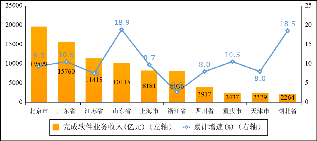 主要軟件大省收入占比小幅提升。1—11月份,軟件業(yè)務(wù)收入居前5名的省份中,北京市、廣東省、江蘇省、山東省、上海市軟件收入分別為19599億元、15760億元、11418億元、10115億元和8181億元,分別增長(zhǎng)9.3%、10.5%、7.5%、18.9%和9.7%,五?。ㄊ校┖嫌?jì)軟件業(yè)務(wù)收入65074億元,占全國(guó)比重為68.7%,占比較去年同期提高0.1個(gè)百分點(diǎn)。