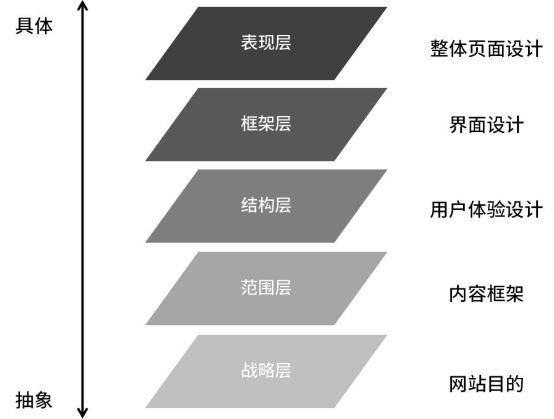 縱向來(lái)看,網(wǎng)站的策劃是一個(gè)從抽象到具體的過(guò)程,一般經(jīng)歷五個(gè)層面:戰(zhàn)略層、范圍層、結(jié)構(gòu)層、框架層、表現(xiàn)層。