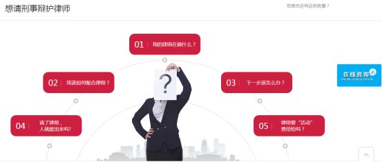 框架層也屬于網(wǎng)頁(yè)設(shè)計(jì),這里面包含了視覺設(shè)計(jì)、任務(wù)流、信息流等,具體表現(xiàn)為風(fēng)格統(tǒng)一,色彩搭配,排版,利用和滿足用戶視覺、聽覺、觸覺、視覺、嗅覺需求等,這些設(shè)計(jì)由律師想要的品牌調(diào)性、風(fēng)格、業(yè)務(wù)決定,比如色系,紅色更適合溫馨的婚姻家事業(yè)務(wù),藍(lán)色適合刑事等。