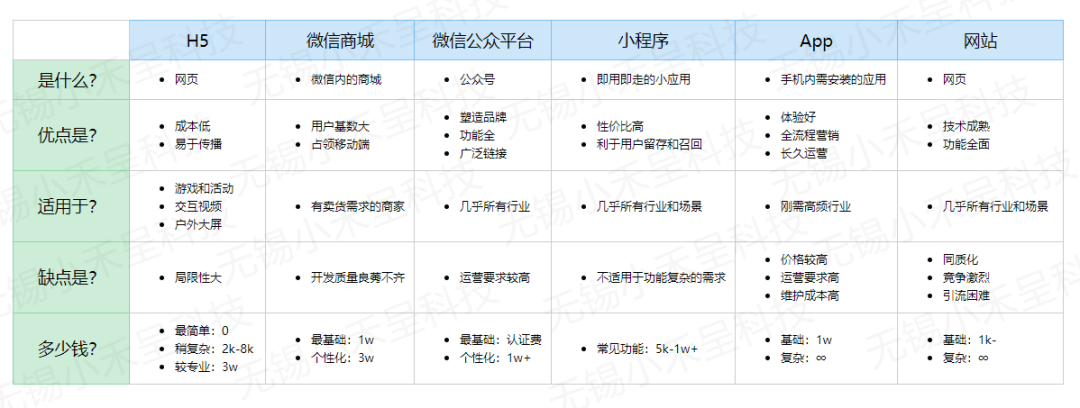 的確,對于外行人來說,H5、公眾號、小程序、App、官網(wǎng)……互聯(lián)網(wǎng)的花樣太多了,哪一個才是最適合自己的呢?